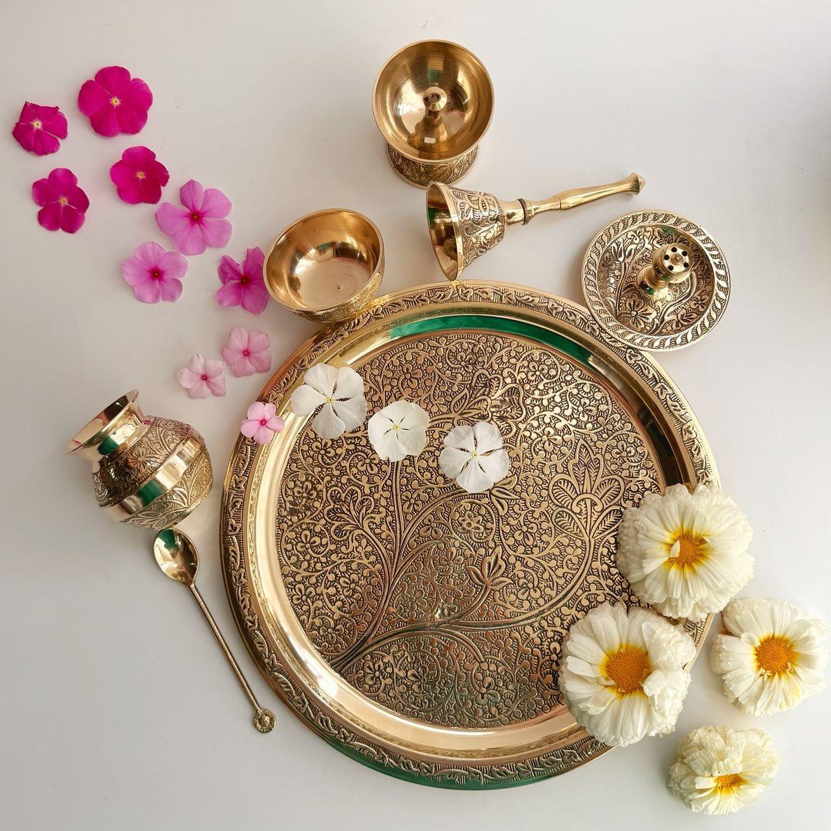 Brass, an alloy of copper and zinc, is cherished in Hindu tradition for its golden shine, durability, and purity. Associated with Goddess Lakshmi, it symbolizes prosperity and positivity. Its natural antimicrobial properties keep offerings pure, while brass diyas, bells, and thalis enhance the spiritual energy of rituals. Using brass in pooja is believed to invite blessings, ward off negativity, and preserve sacred traditions.